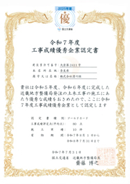 - 令和7年度工事成績優秀企業として認定(9年連続受賞)
